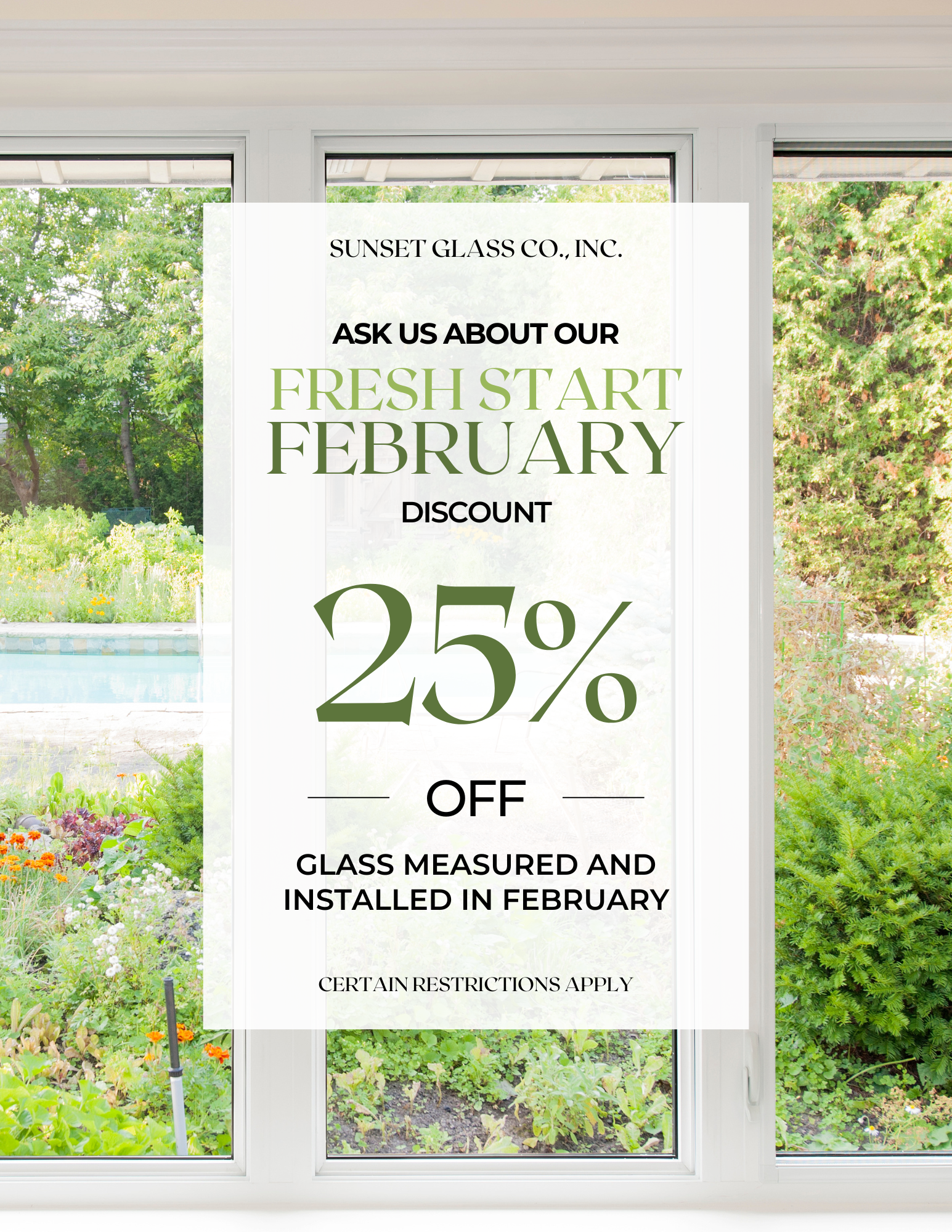 Ask us about our Fresh Start February Discount: 25% off glass measured and installed in February. Certain restrictions apply.